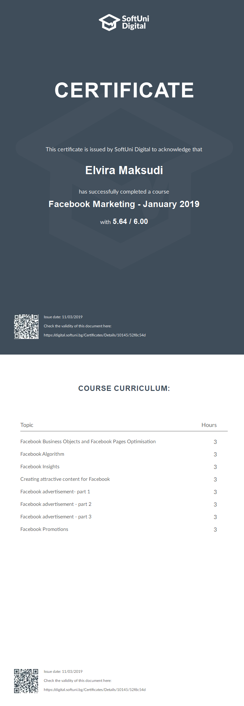 Сертификат - Facebook Marketing - January 2019 - SoftUni Digital
