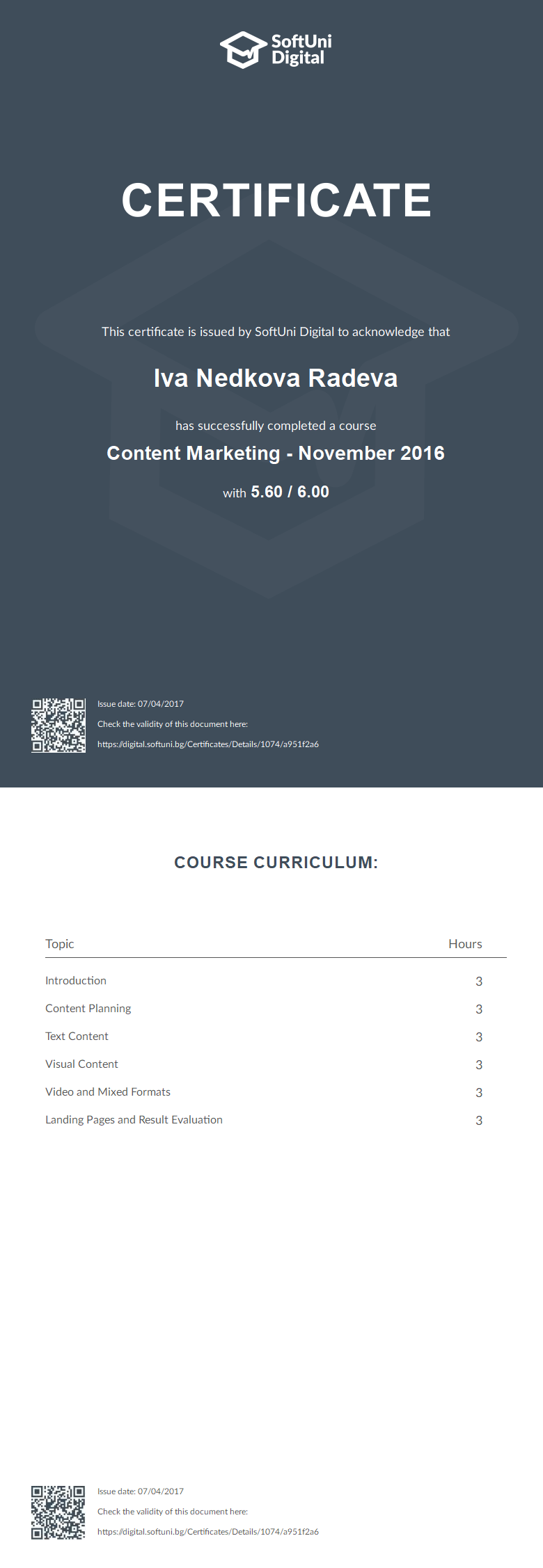 Сертификат - Content Marketing - November 2016 - SoftUni Digital