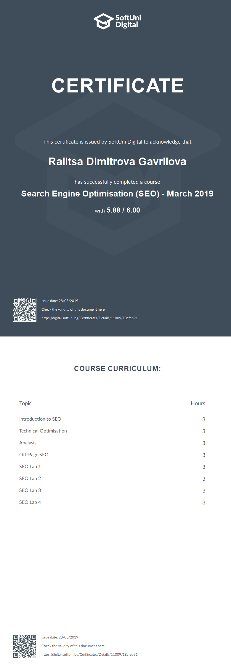 Сертификат - Search Engine Optimisation (SEO) - March 2019 - SoftUni Digital