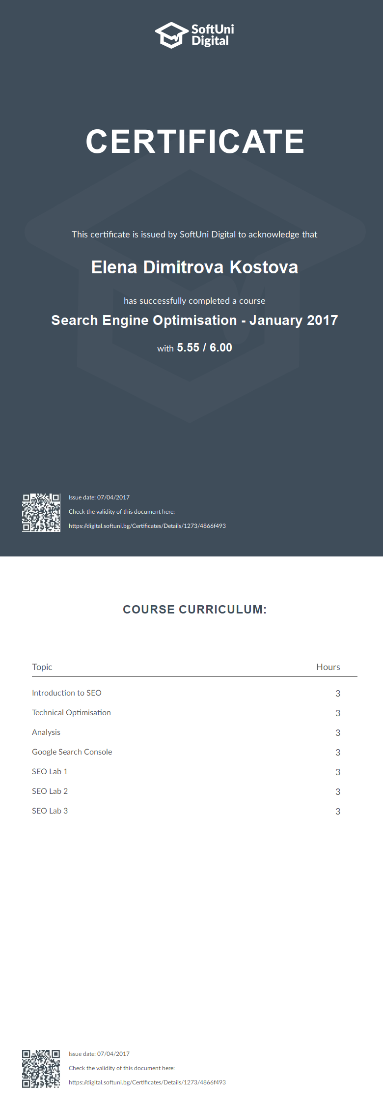 Сертификат - Search Engine Optimisation - January 2017 - SoftUni Digital