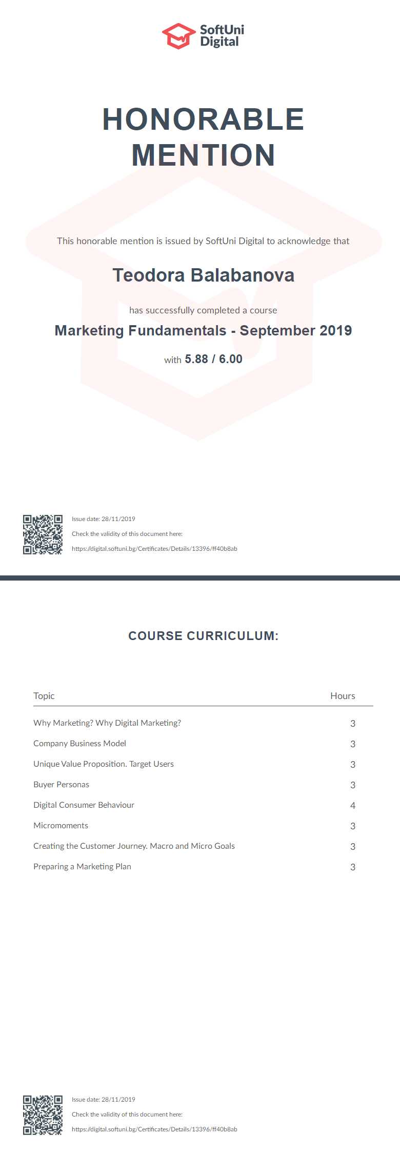 This honorable mention is issued by SoftUni Digital to acknowledge that