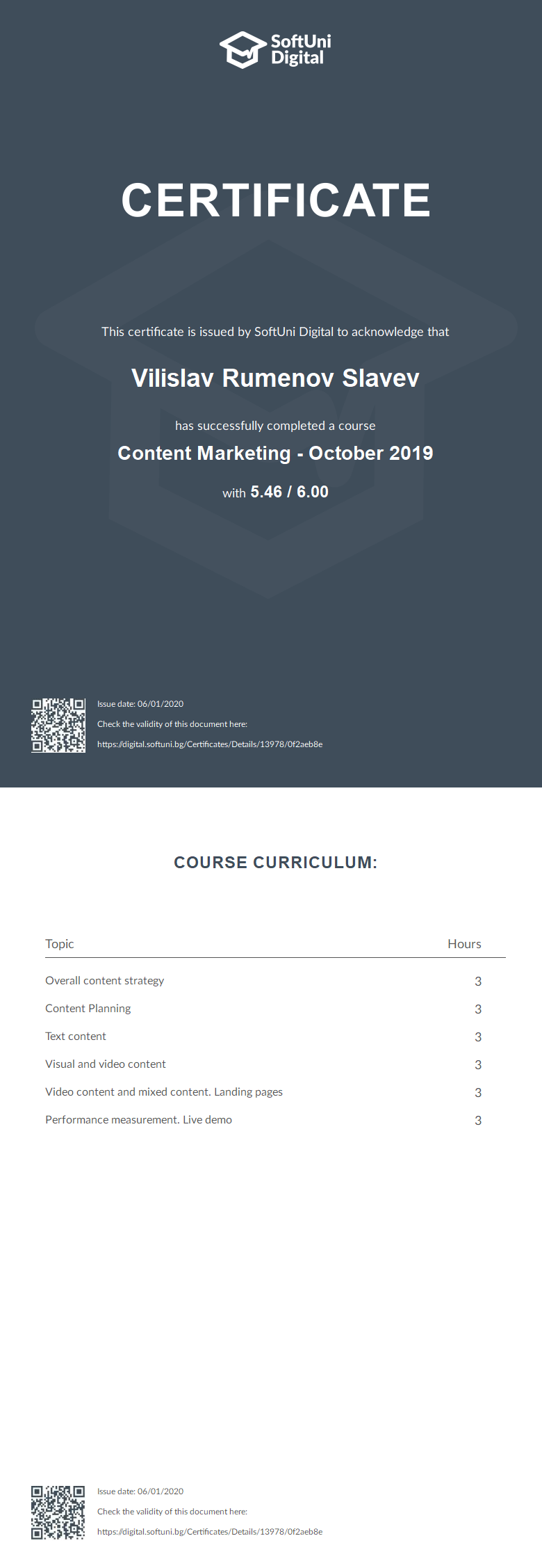 Сертификат - Content Marketing - October 2019 - SoftUni Digital