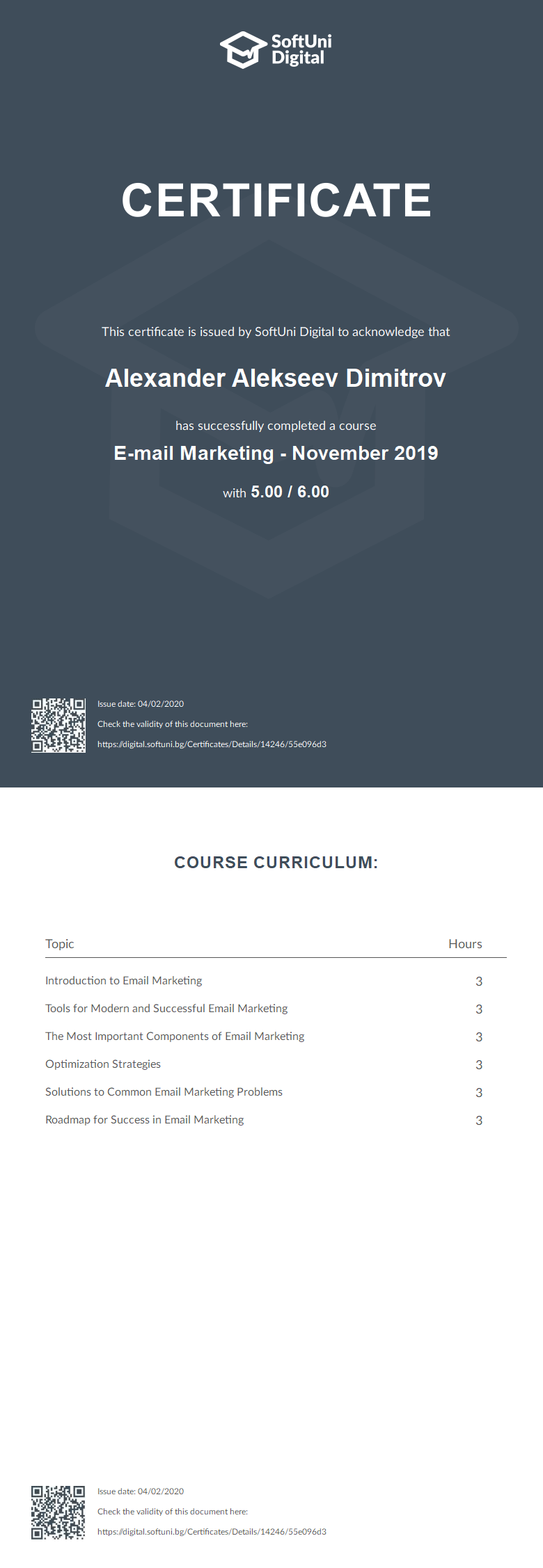 Сертификат - E-mail Marketing - November 2019 - SoftUni Digital