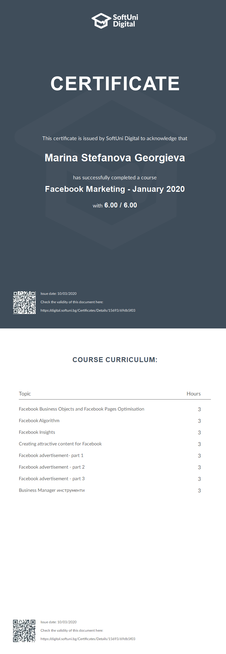 Сертификат - Facebook Marketing - January 2020 - SoftUni Digital