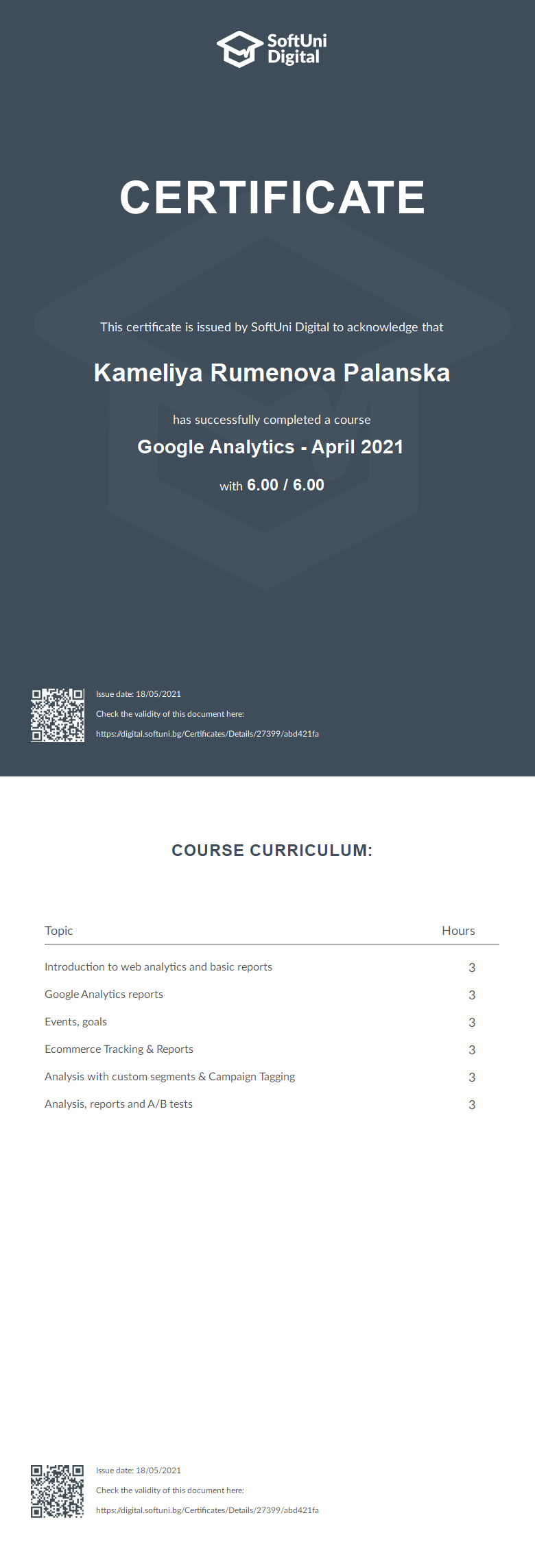 Сертификат - Google Analytics - April 2021 - SoftUni Digital