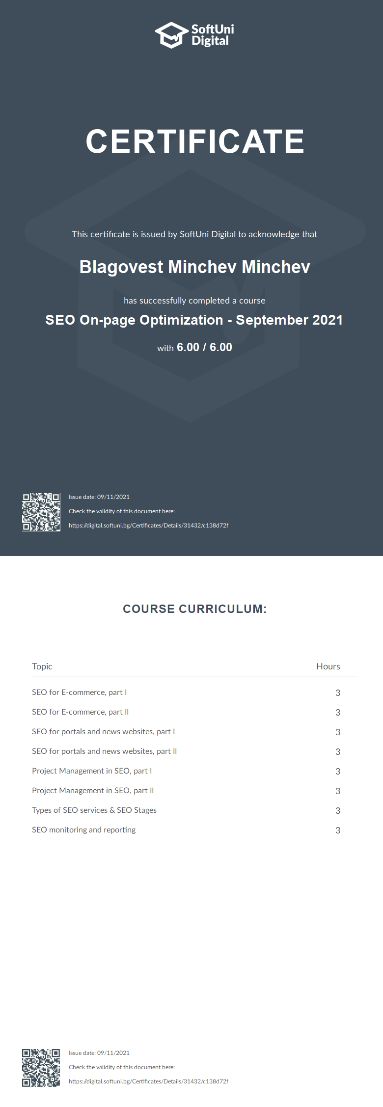 Сертификат - SEO On-page Optimization - September 2021 - SoftUni Digital