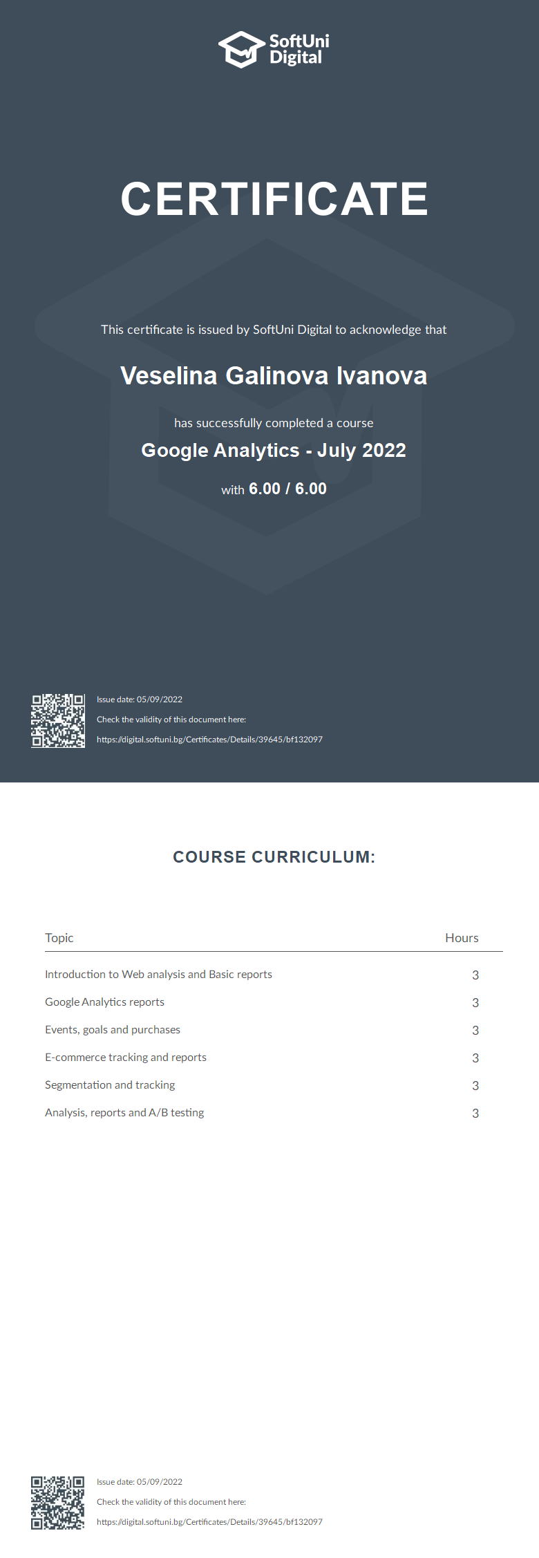 Сертификат - Google Analytics - July 2022 - SoftUni Digital