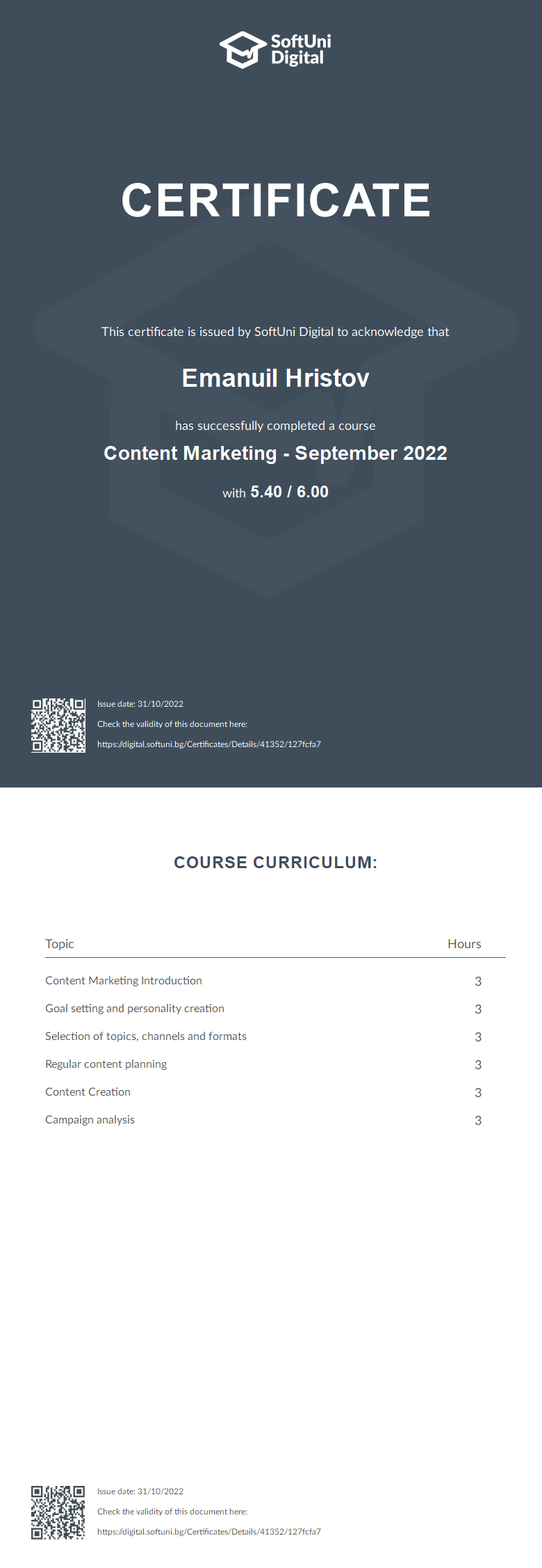 Сертификат - Content Marketing - September 2022 - SoftUni Digital