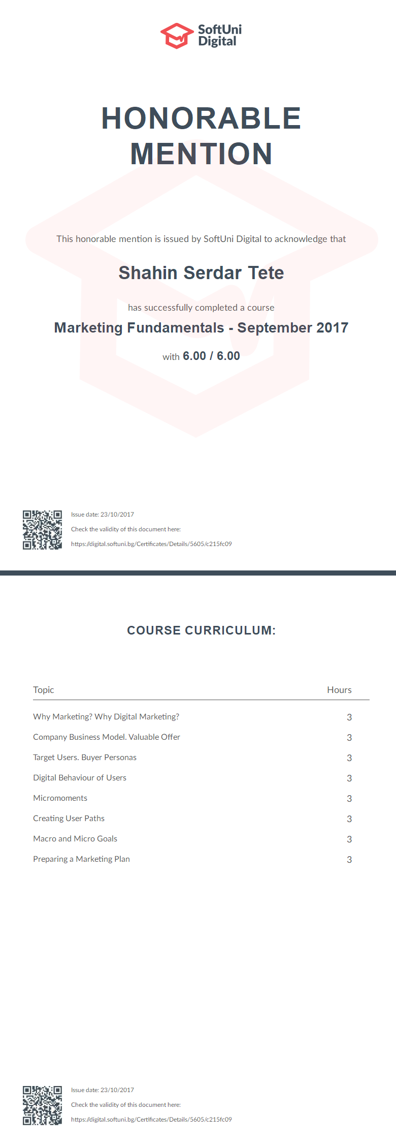 This honorable mention is issued by SoftUni Digital to acknowledge that