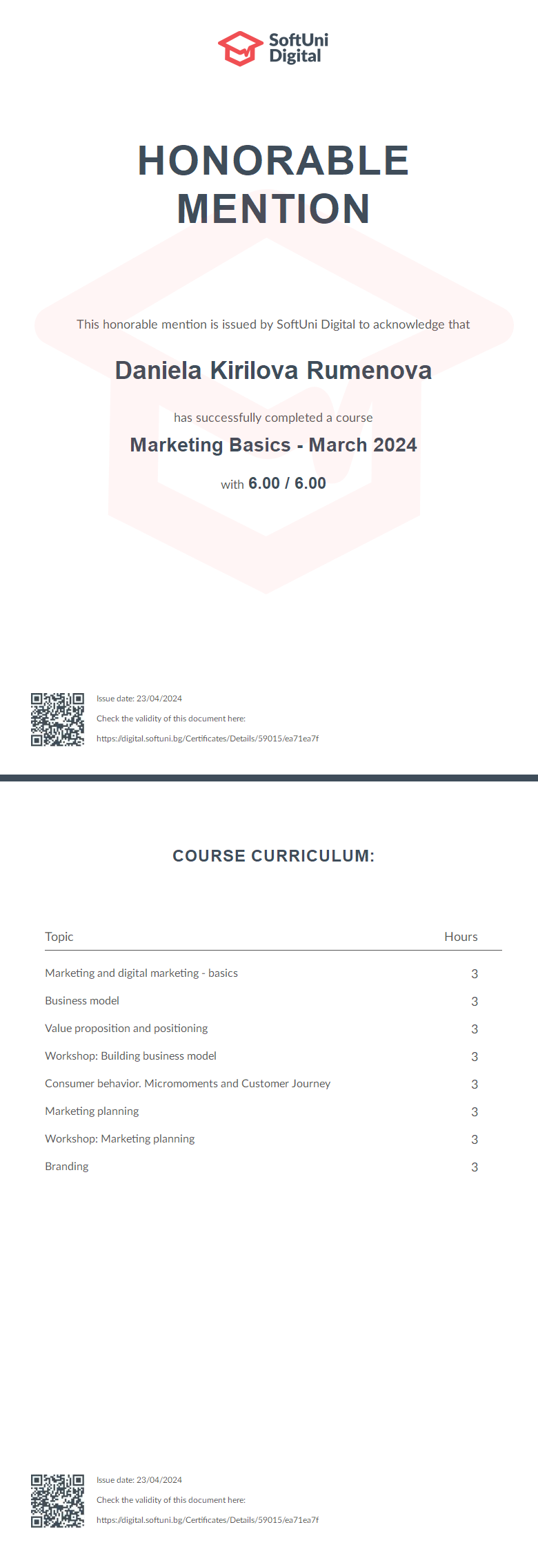 This honorable mention is issued by SoftUni Digital to acknowledge that
