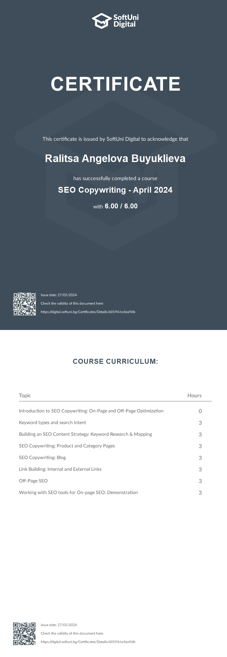 This certificate is issued by SoftUni Digital to acknowledge that