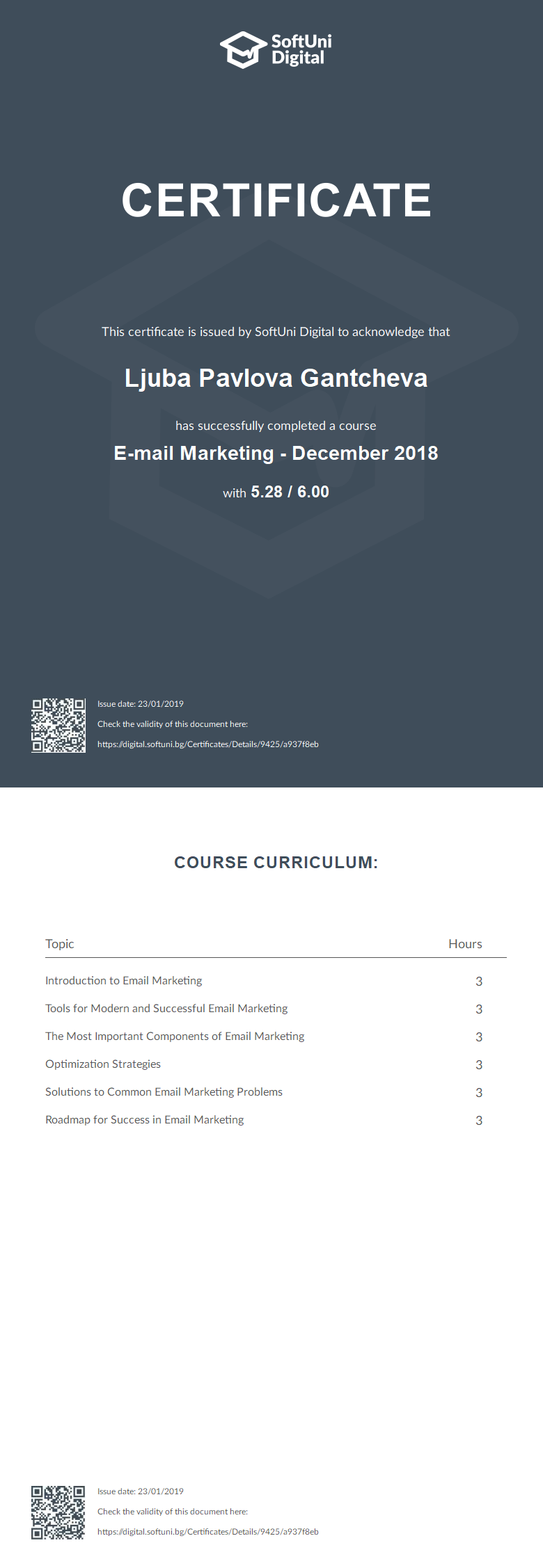 Сертификат - E-mail Marketing - December 2018 - SoftUni Digital